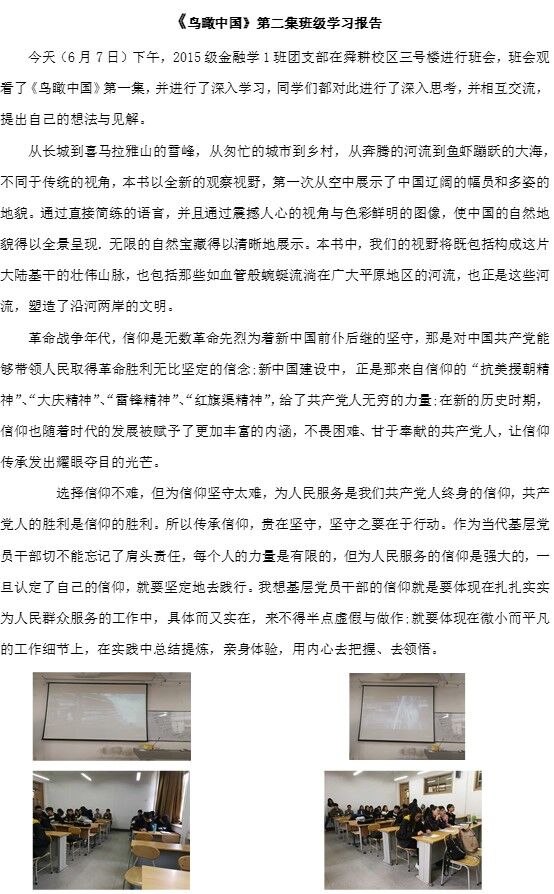 为使我院学子更加了解我国的悠久历史,更好的感受中国传统的精神文化瑰宝,体会中华文化传统和民族特色,增强青年学生的国家荣誉感和自豪感,培养符合中国特色社会主义发展需要的社会主义接班人。我院组织学生进行第十四周“党团活动日”系列活动。本次活动中,我院组织金融学院全体硕士生和本科生共同观看了《鸟瞰中国》第二集。
