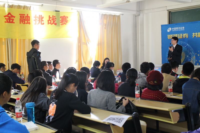 10月29日下午,中国银河证券在圣井校区闻道楼3205室带来了一场精彩的讲座。中国银河证券山东分公司总经理张华胜、济南经七路营业部总经理武云鹏,学院党委副书记徐明春、辅导员陈静等出席了本次讲座。2014级、2015级部分同学参加了讲座。