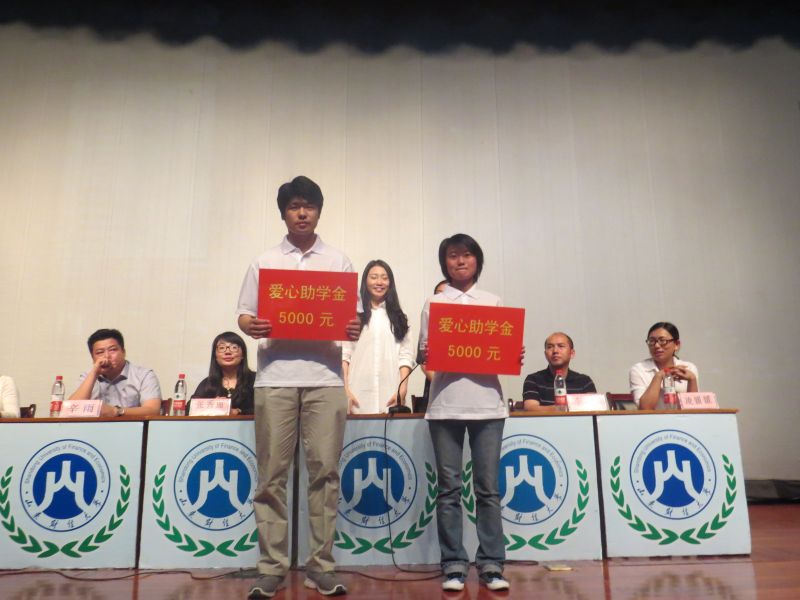 讲话完毕后,学工办主任兼团委书记彭艳红与冠群驰骋投资管理(北京)有限公司津鲁大区副总罗潇共同签署助学基金协议,并向我校金融学院两名家庭经济困难学生发放助学金,共计一万元,旨在帮助他们顺利完成学业。
